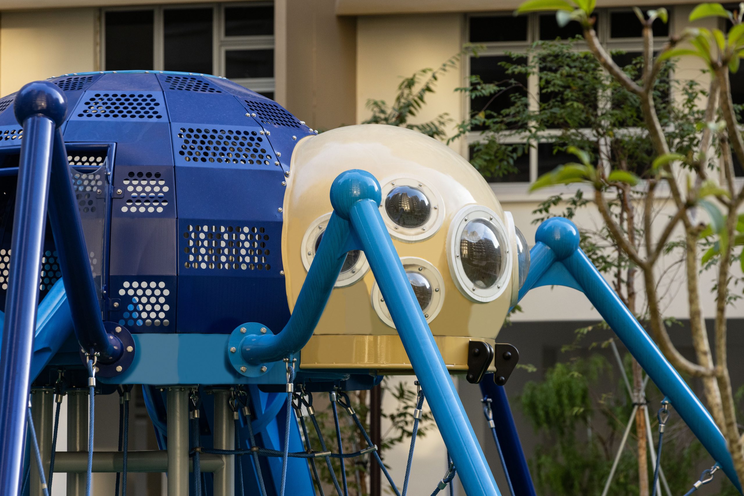 Tucked beneath shady trees, this vibrant green and yellow structure mimics the delicate form of a leaf insect. Kids can climb, slide, and perch on leafy platforms, all while surrounded by lush landscaping that mirrors the playground’s camouflaged creature.